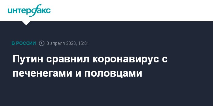 Москва. 8 апреля. INTERFAX.RU - Президент Владимир Путин заявил, что пандемия коронавируса пройдет. Он выразил уверенность, что Россия ее переживет, как в свое время пережила набеги печенегов и половцев. Он сказал это на совещании с губернаторами и министрами по проблеме сдерживания распространения инфекции.