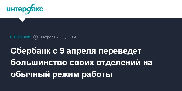 Москва. 8 апреля. INTERFAX.RU - Сбербанк России переведет до 100% своих отделений на обычный режим работы с 9 апреля, говорится в пресс-релизе кредитной организации.