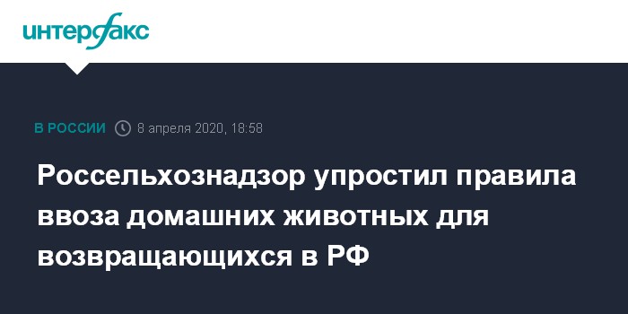 Москва. 8 апреля. INTERFAX.RU - Россельхознадзор упрощает правила ввоза животных-компаньонов, принадлежащих гражданам, которые в настоящее время находятся на территории других стран и планируют вернуться в Россию в связи с неблагоприятной эпидемиологической обстановкой.