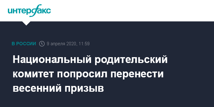 Москва. 9 апреля. INTERFAX.RU - Национальный родительский комитет обратился к премьер-министру Михаилу Мишустину и министру обороны Сергею Шойгу с просьбой перенести весенний призыв, сообщает газета "Известия" со ссылкой на обращение комитета.