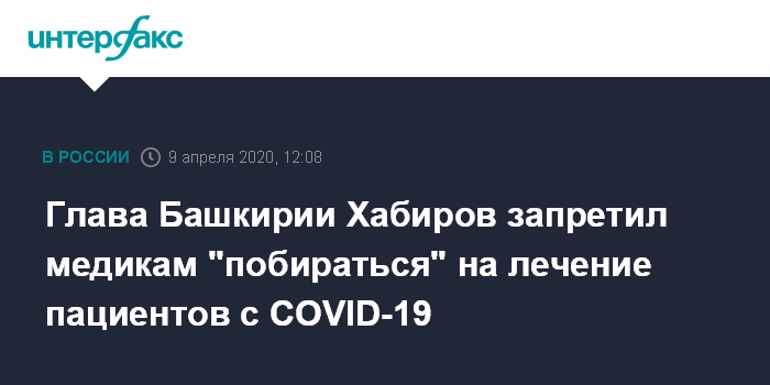 Москва. 9 апреля. INTERFAX.RU - Глава Башкирии Радий Хабиров запретил сотрудникам учреждений здравоохранения, задействованных в мероприятиях по нераспространению коронавируса, обращаться к населению и предприятиям региона с просьбой о благотворительности.
