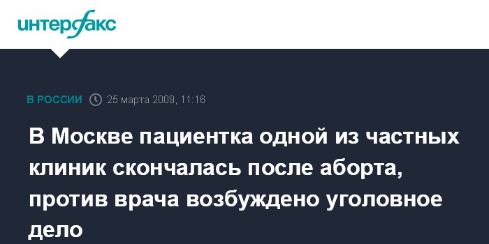 Москва. 25 марта. INTERFAX.RU - Главный врач одной из частных столичных клиник подозревается в том, что провела аборт на поздних сроках беременности 25-летней женщине, в результате которого пациентка скончалась, сообщили "Интерфаксу" в СКП РФ в среду.