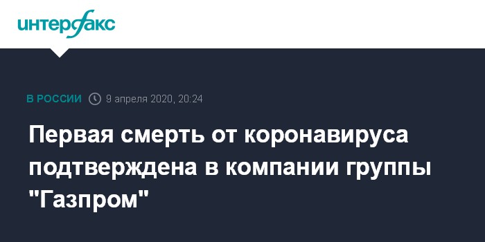 Москва. 9 апреля. INTERFAX.RU - Первая смерть от коронавируса подтверждена в компании группы "Газпром" - ООО "Газпром трансгаз Югорск", сообщил "Интерфаксу" источник, знакомый с ситуацией.