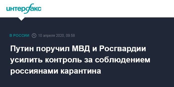 Москва. 10 апреля. INTERFAX.RU - Президент Владимир Путин поручил МВД РФ и Росгвардии принять дополнительные меры по соблюдению карантина россиянами, которые вернулись из стран с неблагополучной ситуацией с коронавирусной инфекцией, сообщает сайт Кремля.