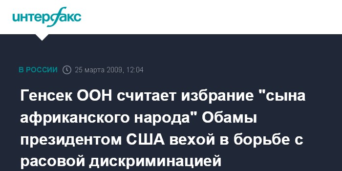 Генсек ООН считает избрание "сына африканского народа" Обамы президентом США вехой в борьбе с расовой дискриминацией