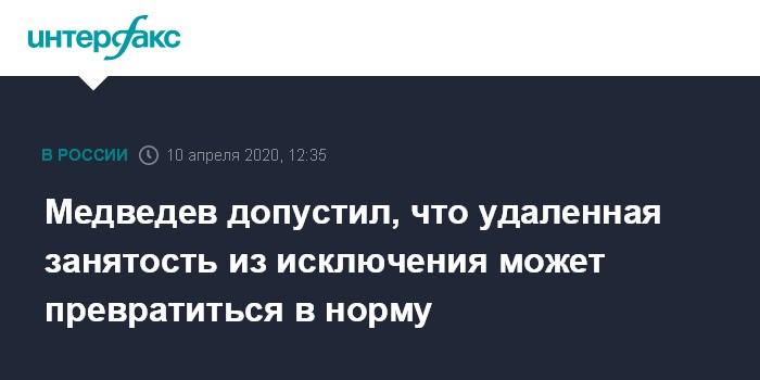 Москва. 10 апреля. INTERFAX.RU - Ситуация с распространением коронавируса изменяет трудовое право и делает работников более независимыми от работодателей, считает заместитель председателя Совета Безопасности РФ Дмитрий Медведев; он также допускает, что пандемия может привести к тому, что удаленная занятость, которую сейчас массово практикуют компании и органы госвласти, из исключения превратится в норму.