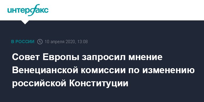 Москва. 10 апреля. INTERFAX.RU - Совет Европы (СЕ) запросил оценку Венецианской комиссии по планируемым к внесению в российскую Конституцию поправкам, сообщила генеральный секретарь СЕ Мария Пейчинович-Бурич, выступая в пятницу на Санкт-Петербургском международном юридическом форуме.