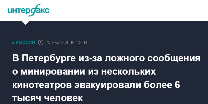 Москва. 25 марта. INTERFAX.RU – В Петербурге задержан и направлен в психиатрическую больницу мужчина, сообщивший накануне о заминировании одного из кинотеатров, сообщает пресс-служба ГУВД по городу и области.