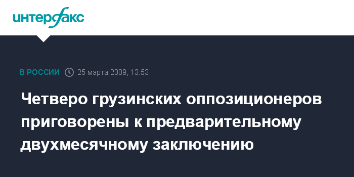Москва. 25 марта. INTERFAX.RU – Тбилисский городской суд в среду вынес приговор о двухмесячном предварительном заключении членам общественного движения "За спасение Грузии" по обвинению в попытке госпереворота и терроризме.
