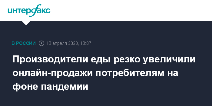 Москва. 13 апреля. INTERFAX.RU - Производители еды в России резко увеличили онлайн-продажи продуктов конечному потребителю на фоне ограничений, введенных из-за пандемии коронавируса, пишут в понедельник "Ведомости" со ссылкой на информацию от участников рынка.
