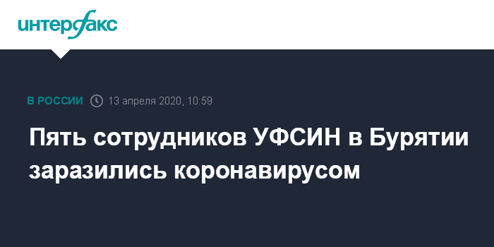 Москва. 13 апреля. INTERFAX.RU - Коронавирусную инфекцию выявили у пяти сотрудников управления федеральной службы исполнения наказаний по Бурятии. Об этом сообщила в среду на брифинге руководителя управления Роспотребнадзора республики Елена Кузьмина.