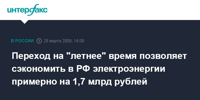 Москва. 25 марта. INTERFAX.RU – Переход на "летнее" время в РФ позволяет сэкономить с апреля по октябрь примерно 2 млрд кВт.ч электроэнергии, что сопоставимо с объемом электропотребления в целом по ЕЭС России за сутки, сообщили "Интерфаксу" в ОАО "Системный оператор ЕЭС", которое занимается диспетчеризацией энергосистемы РФ.