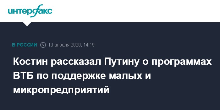 По словам Костина, с 30 марта ВТБ запустил собственные программы поддержки малых и микропредприятий: им, в частности, предоставляется отсрочка по платежам до 6 месяцев. ВТБ получил около 5 ты. заявлений на общую сумму 226 млрд руб., одобрены обращения на 160 млрд руб.