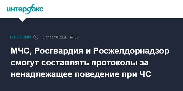 Москва. 13 апреля. INTERFAX.RU - Премьер-министр РФ Михаил Мишустин подписал распоряжение, согласно которому сотрудники МЧС, Росгвардии, Росжелдорнадзора и других ведомств имеют право составлять протоколы об административном правонарушении за невыполнение правил поведения при чрезвычайных ситуациях.