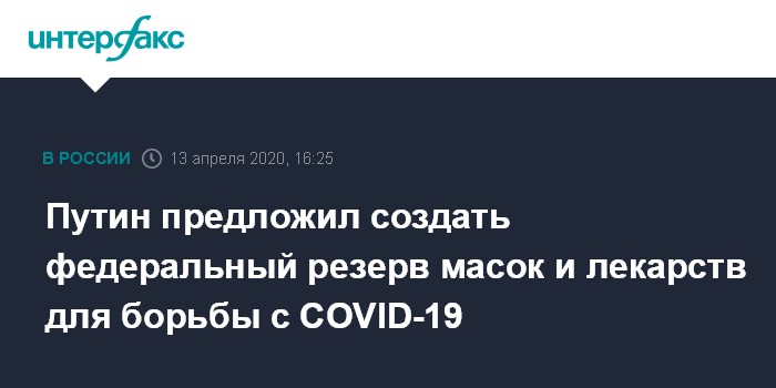 Москва. 13 апреля. INTERFAX.RU - Президент России Владимир Путин считает нужным создать в России специальный резерв средств индивидуальной защиты, лекарств и оборудования для борьбы с коронавирусом.