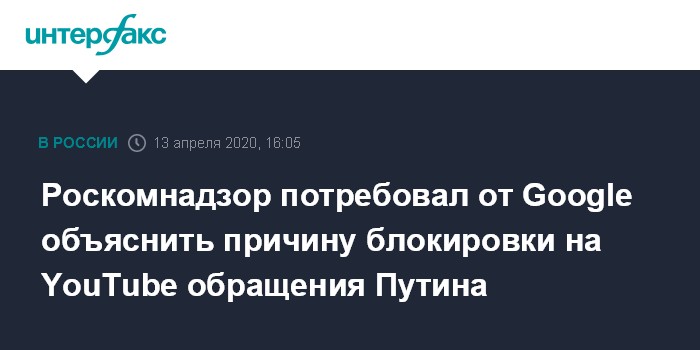 Москва. 13 апреля. INTERFAX.RU - Роскомнадзор потребовал от Google объяснить блокировку на видеохостинге YouTube обращения президента в связи с коронавирусом, посчитав это проявлением цензуры.