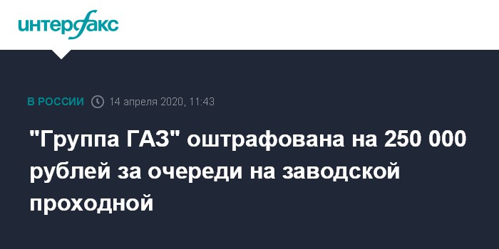 Москва. 14 апреля. INTERFAX.RU - В Нижнем Новгороде Автозаводский суд оштрафовал ООО "УК "Группа ГАЗ"" на 250 000 рублей за очередь на проходной утром 13 апреля. Об этом сообщила объединенная пресс-служба областных судов общей юрисдикции.
