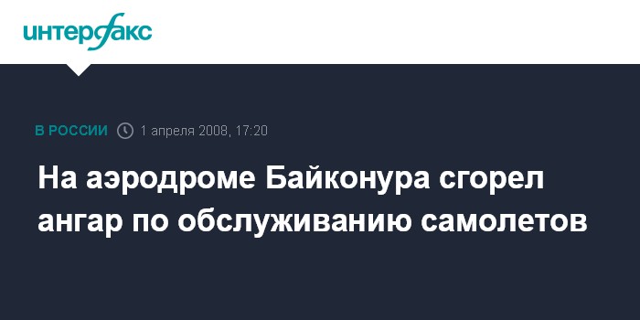 Байконур. 1 апреля. INTERFAX.RU - На аэродроме "Крайний" космодрома Байконур сгорел ангар по обслуживанию самолетов, сообщил агентству "Интерфакс" информированный источник. По его информации, пожар произошел еще в минувшую субботу. "Сгорел эллинг, в котором располагались сооружения для технического обслуживания оборудования самолетов и вертолетов, помещения сотрудников технических служб аэродрома и оборудование", - сказал он. Общая площадь пожара составила около 500 квадратных метров, добавил источник.