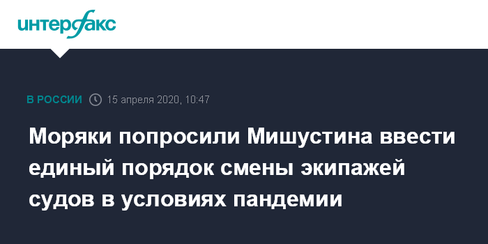 Москва. 15 апреля. INTERFAX.RU - Моряки попросили премьер-министра Михаила Мишустина поручить Минтрансу и Роспотребнадзору ввести единый порядок смены экипажей с учетом карантинных ограничений для судов, прибывающих из-за рубежа. Об этом пишет "Коммерсантъ" со ссылкой на обращение Российского профсоюза моряков (РПСМ).