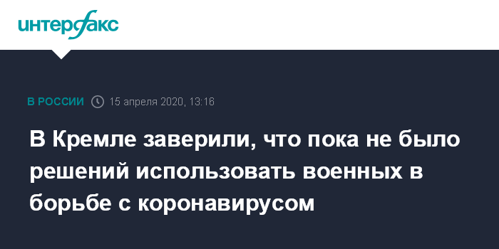 Москва. 15 апреля. INTERFAX.RU - Решений привлечь военных к мерам по борьбе с коронавирусом пока не принималось, а когда президент Владимир Путин говорил о такой возможности, он имел в виду военных врачей, объяснил пресс-секретарь главы государства Дмитрий Песков.
