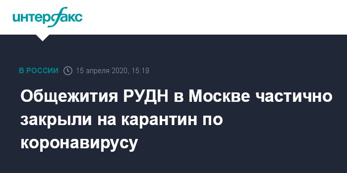 Москва. 15 апреля. INTERFAX.RU - В Москве некоторые блоки общежитий Российского университета дружбы народов (РУДН) закрылись на карантин из-за единичных случаев заражения коронавирусом. Об этом сообщила пресс-служба вуза. Заболевших изолировали.
