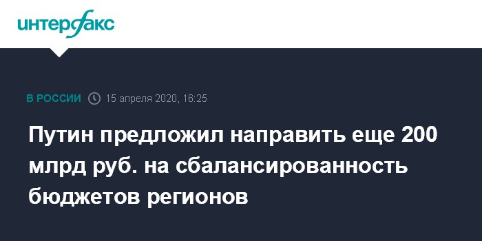 Москва. 15 апреля. INTERFAX.RU - Президент РФ Владимир Путин предложил дополнительно направить в регионы 200 млрд рублей на обеспечение сбалансированности региональных бюджетов.