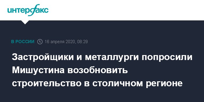 Москва. 16 апреля. INTERFAX.RU - Застройщики Москвы и Подмосковья, а также металлурги попросили премьер-министра Михаила Мишустина помочь им добиться пересмотра решения об остановке строительства в столичном регионе и не допустить продления простоя. Об их письме премьеру "Интерфаксу" сообщили источники в обеих отраслях.