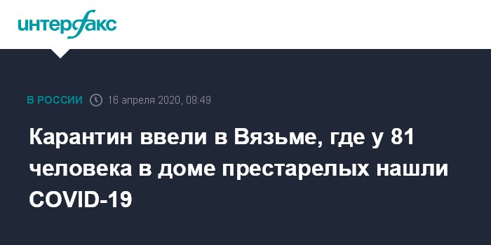 Москва. 16 апреля. INTERFAX.RU - Губернатор Смоленской области Алексей Островский подписал постановление о введении карантина в городе Вязьма, где коронавирусом заразились более 80 человек из числа постояльцев и работников дома-интерната для престарелых и инвалидов.