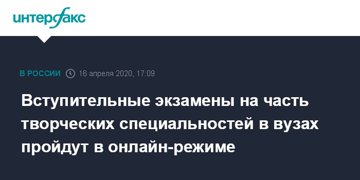 Москва. 16 апреля. INTERFAX.RU - Прием студентов и вступительные испытания на большинство направлений подготовки в творческие вузы, подведомственные Минкультуры РФ, пройдут в этом году в онлайн-формате из-за коронавируса, говорится в обращении министра культуры РФ Ольги Любимовой, опубликованном на сайте министерства.