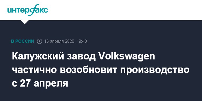 Москва. 16 апреля. INTERFAX.RU - ООО "Фольксваген Груп Рус" (российское подразделение германского автомобилестроительного концерна Volkswagen) начнет постепенное возобновление производства на заводе в Калуге с 27 апреля, сообщили "Интерфаксу" в пресс-службе предприятия.
