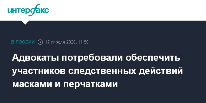 Москва. 17 апреля. INTERFAX.RU - Федеральная палата адвокатов призвала председатель СКР Александра Бастрыкина обеспечить всех участников следственных действий, в том числе следователей, подследственных и их защитников, индивидуальными средствами защиты от коронавируса.
