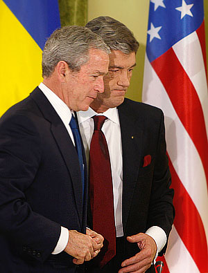 В свою очередь, Ющенко заявил, что не видит иного курса для своей страны, кроме как в НАТО. "Когда мы объясним нации, какова миссия коллективной политики безопасности, в чем ответ для Украины и почему для нас альтернативного ответа не существует, и почему нам нужно быть там, я вас убеждаю, что украинская нация, мудрая нация, примет положительное решение по тому референдуму, который мы, безусловно, будем проводить" – сказал он на совместной с Бушем пресс-конференции.