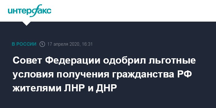 Москва. 17 апреля. INTERFAX.RU - Совет Федерации на заседании в пятницу одобрил закон о введении льготных условий приема в российское гражданство для жителей самопровозглашенных Донецкой и Луганской народных республик (ДНР и ЛНР) с отменой пошлины.