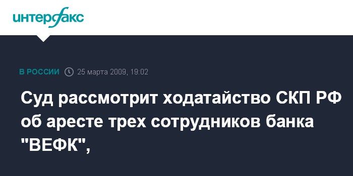 Суд рассмотрит ходатайство СКП РФ об аресте трех сотрудников банка "ВЕФК",