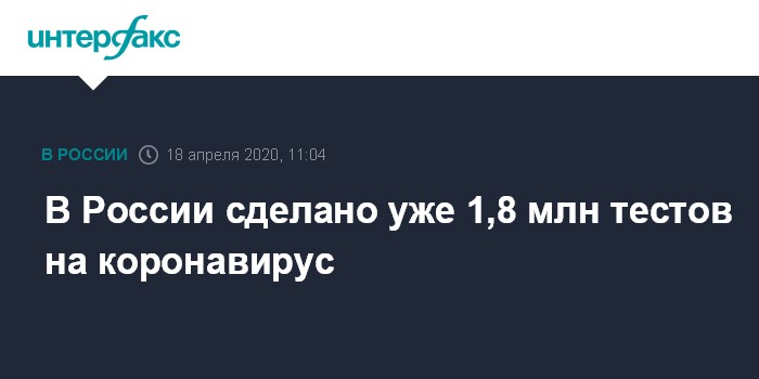 Москва. 18 апреля. INTERFAX.RU - Роспотребнадзор сообщает, что общее число исследований на новую коронавирусную инфекцию в РФ увеличилось до 1,83 млн.