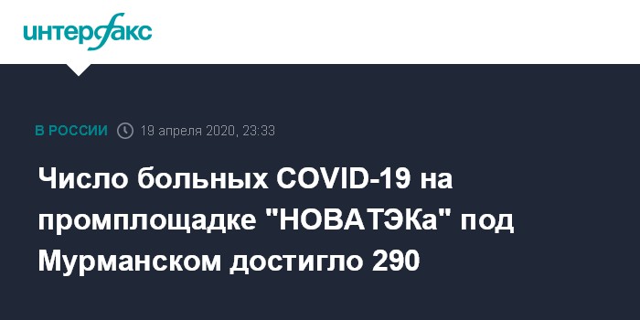 Москва. 19 апреля. INTERFAX.RU - Количество больных коронавирусом среди рабочих на промплощадке Центра строительства крупнотоннажных морских сооружений (ЦСКМС) ООО "НОВАТЭК-Мурманск" в селе Белокаменка, где произошла вспышка COVID-19, за сутки выросло до 290 человек, сообщает оперативный штаб Мурманской области.
