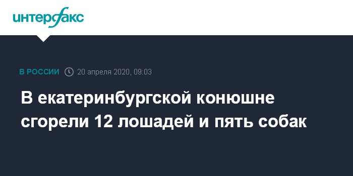Москва. 20 апреля. INTERFAX.RU - В Екатеринбурге утром в понедельник сгорела частная конюшня на Кировоградской улице, погибли 12 лошадей и пять собак, сообщило областное управление МЧС.