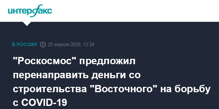 Москва. 20 апреля. INTERFAX.RU - "Роскосмос" предложил перенаправить часть бюджетных средств, выделявшихся на строительство стартового комплекса для ракет "Ангара" на космодроме "Восточный", для финансирования кабинетом министров мер по борьбе с COVID-19, сообщил "Интерфаксу" источник в ракетно-космической отрасли.