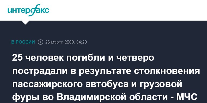 Владимир. 26 марта. ИНТЕРФАКС - В результате столкновения пассажирского автобуса "Неоплан" и грузовой фуры на трассе Москва-Нижний Новгород, в Петушинском районе Владимирской области, погибли 25 человек, четверо пострадали.