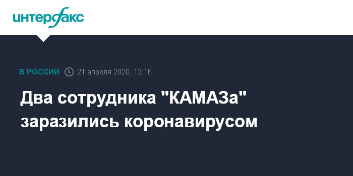 Москва. 21 апреля. INTERFAX.RU - Коронавирусом заразились два сотрудника "КАМАЗа", оба они были в отпусках и давно не выходили на работу, сообщила пресс-служба компании во "ВКонтакте". Еще у трех сотрудников пока подозревают заражение.