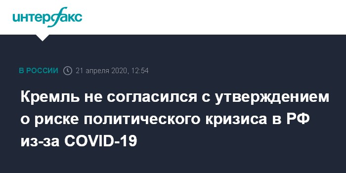 Москва. 21 апреля. INTERFAX.RU - В Кремле не согласны с постановкой вопроса о том, что экономические трудности, вызванные коронавирусом, приведут к политическому кризису в РФ.