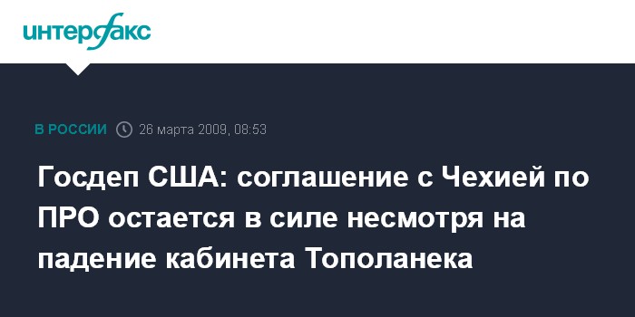 Москва. 26 марта. INTERFAX.RU – Вашингтон рассматривает соглашение с Чехией о размещении на территории этой страны объектов американской ПРО как остающееся в силе, несмотря на отставку чешского правительства во главе с Миреком Тополанеком.