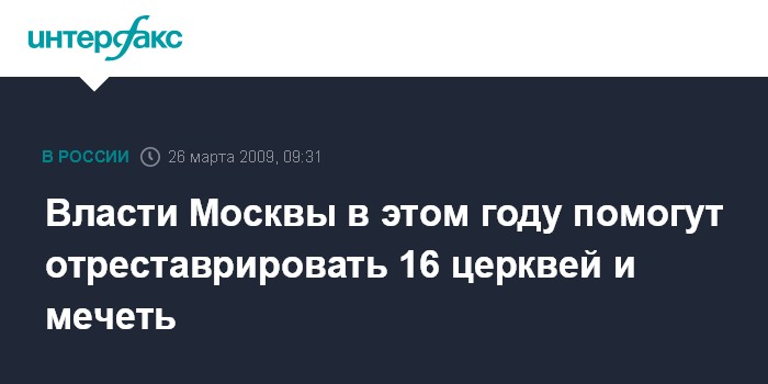Москва. 26 марта. INTERFAX.RU – Власти Москвы в этом году выделят средства на помощь в оказании ремонтно-реставрационных работ в 16 церквях и одной мечети, сообщили "Интерфаксу" в городской администрации в четверг.