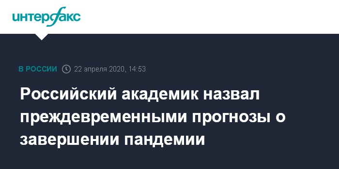 Москва. 22 апреля. INTERFAX.RU - Директор российского Научно-исследовательского центра эпидемиологии и микробиологии академик Александр Гинцбург заявил о преждевременности прогнозов по поводу сроков завершения пандемии коронавируса.