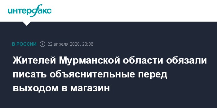 Москва. 22 апреля. INTERFAX.RU - В Мурманской области местные жители перед походом к врачу или даже в ближайший магазин должны написать объяснение и иметь его с собой, сообщает региональный оперативный штаб.