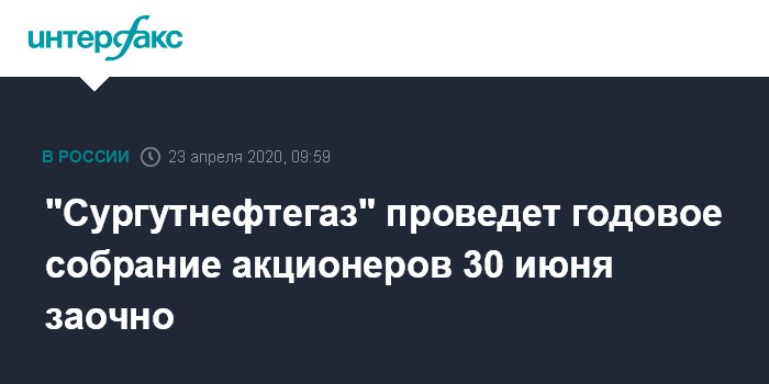 Москва. 23 апреля. INTERFAX.RU - "Сургутнефтегаз" сообщил, что проведет годовое собрание акционеров в заочной форме 30 июня.