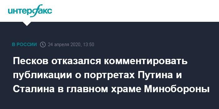 Москва. 24 апреля. INTERFAX.RU - Пресс-секретарь президента Дмитрий Песков отказался комментировать сообщения о том, что интерьеры строящегося в Кубинке главного храма Вооруженных сил будут украшены мозаикой с портретами Владимира Путина, Сергея Шойгу и Иосифа Сталина.