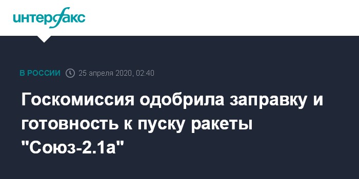 Москва. 25 апреля. INTERFAX.RU - Госкомиссия приняла решение о заправке "Союз-2.1а" и заявила о готовности ракеты к пуску, сообщается в твиттере "Роскосмоса".