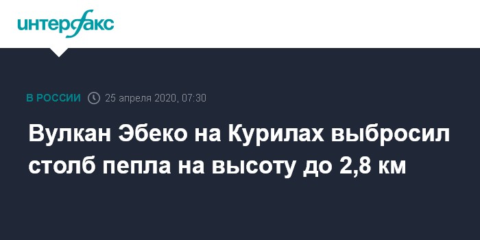 Москва. 25 апреля. INTERFAX.RU - Пепловый выброс произошел в субботу утром на вулкане Эбеко, расположенном на северокурильском острове Парамушир Сахалинской области, сообщает Камчатская группа реагирования на вулканические извержения (KVERT) Института вулканологии и сейсмологии Дальневосточного отделения Российской академии наук.