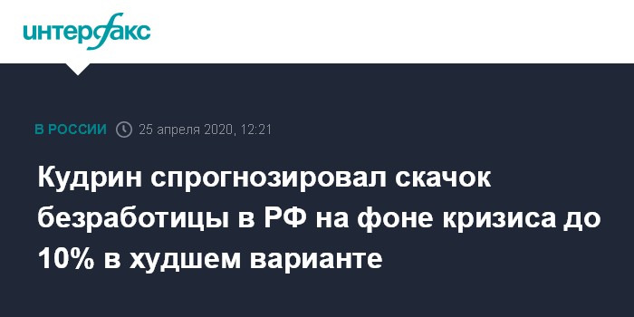 Москва. 25 апреля. INTERFAX.RU - Безработица в России на фоне кризисных явлений в экономике из-за ограничительных мер, принятых для борьбы с эпидемией коронавируса, может в пессимистичном варианте подскочить более чем вдвое, полагает глава Счетной палаты Алексей Кудрин.